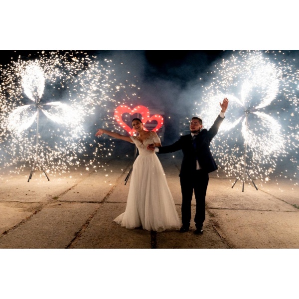 Заказ дорожки из холодных фонтанов — одна из самых популярных услуг на нашем сайте, поэтому мы решили добавить что-то новенькое и более зрелищное! Крутящиеся холодные фонтаны представляют из себя безопасные и малодымные пиротехнические изделия, установленные на специальные устройства для вращения снопов искр, чтобы создать необычный эффект цветка. Впрочем, лучше один раз увидеть, чем сто раз прочесть.